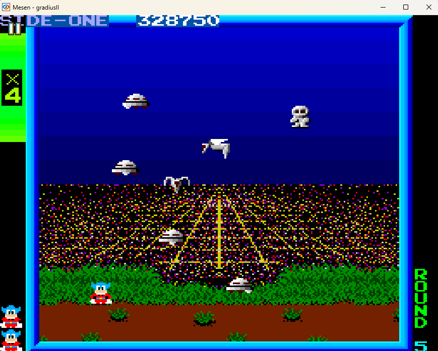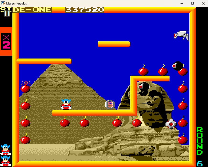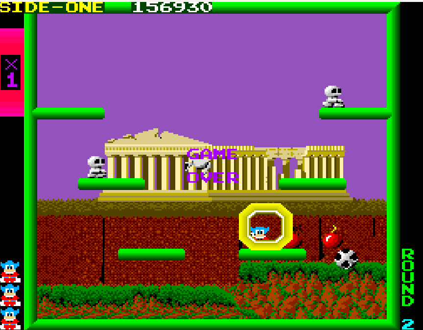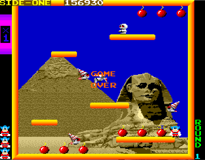 ボンジャックも昔ゲーセンでよく見かけていたものの自分は下手ッピなので数回のプレイ経験のみ...程度の関わり具合。忍者くん同様シンプルなルールですが、基盤性能としては色数がぐんと増えてきた時代なのでグラデーションやカラーアニメーションがかなり豪勢な作りになっており、印象としてはかなり鮮やかな感じがします。ジャックや敵の処理にも小数演算が(多分)ふんだんに使われていたり、特殊な負荷分散を実装していて、このあたりになるともう目視解析はかなり困難です。